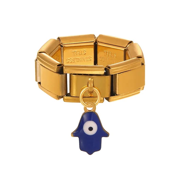 Anillo italiano con dije de mano de fátima esmaltado azul, acero de titanio, ajustable.