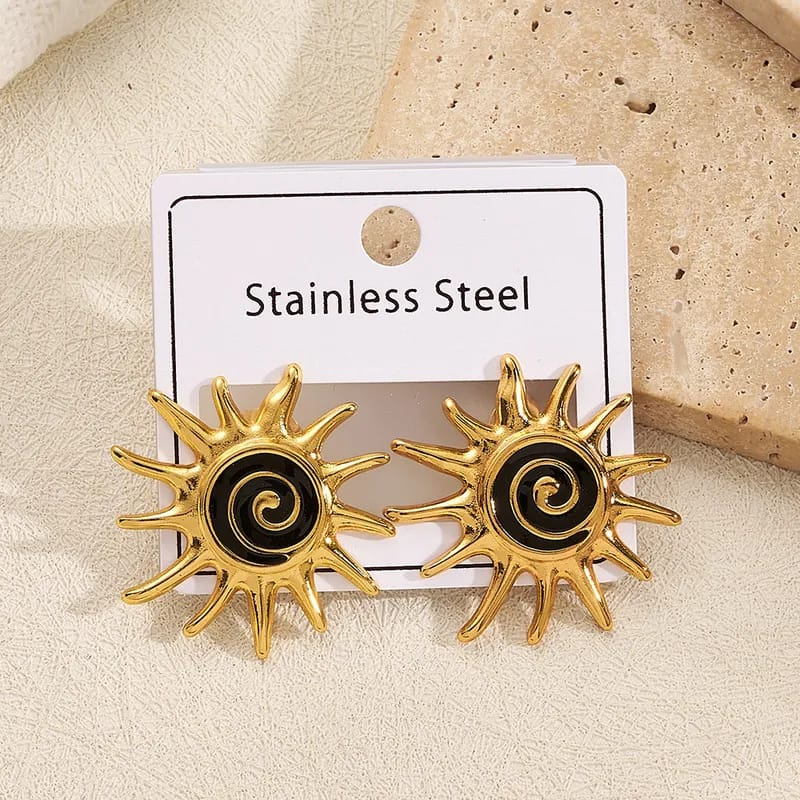 Aretes de sol color negro con dorado, esmaltados, acero inoxidable, bañado en oro, tamaño mediano, ligeros.