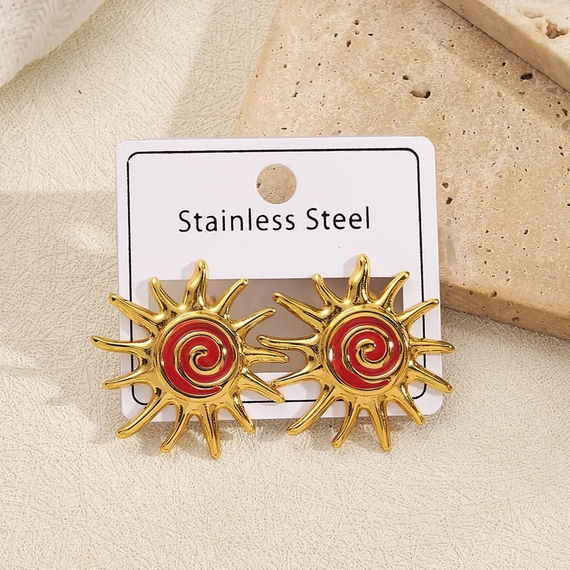 Aretes de sol rojo con dorado esmaltado, acero inoxidable, baño de oro, tamaño mediano, ligeros.