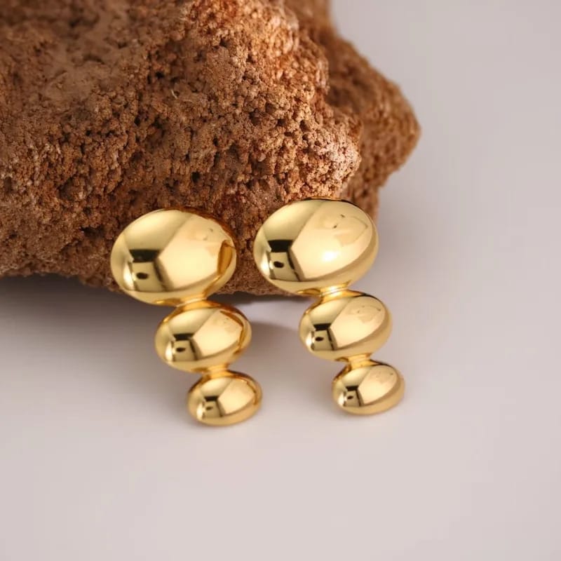 Aretes tres gotas, color dorado, acero inoxidable, chapados, tamaño mediano, ligeros.
