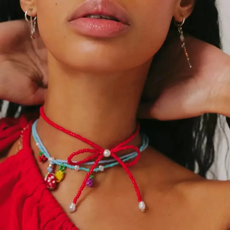 Choker moño de chaquiras en color rojo, extensión de chapa de oro, atemporal.