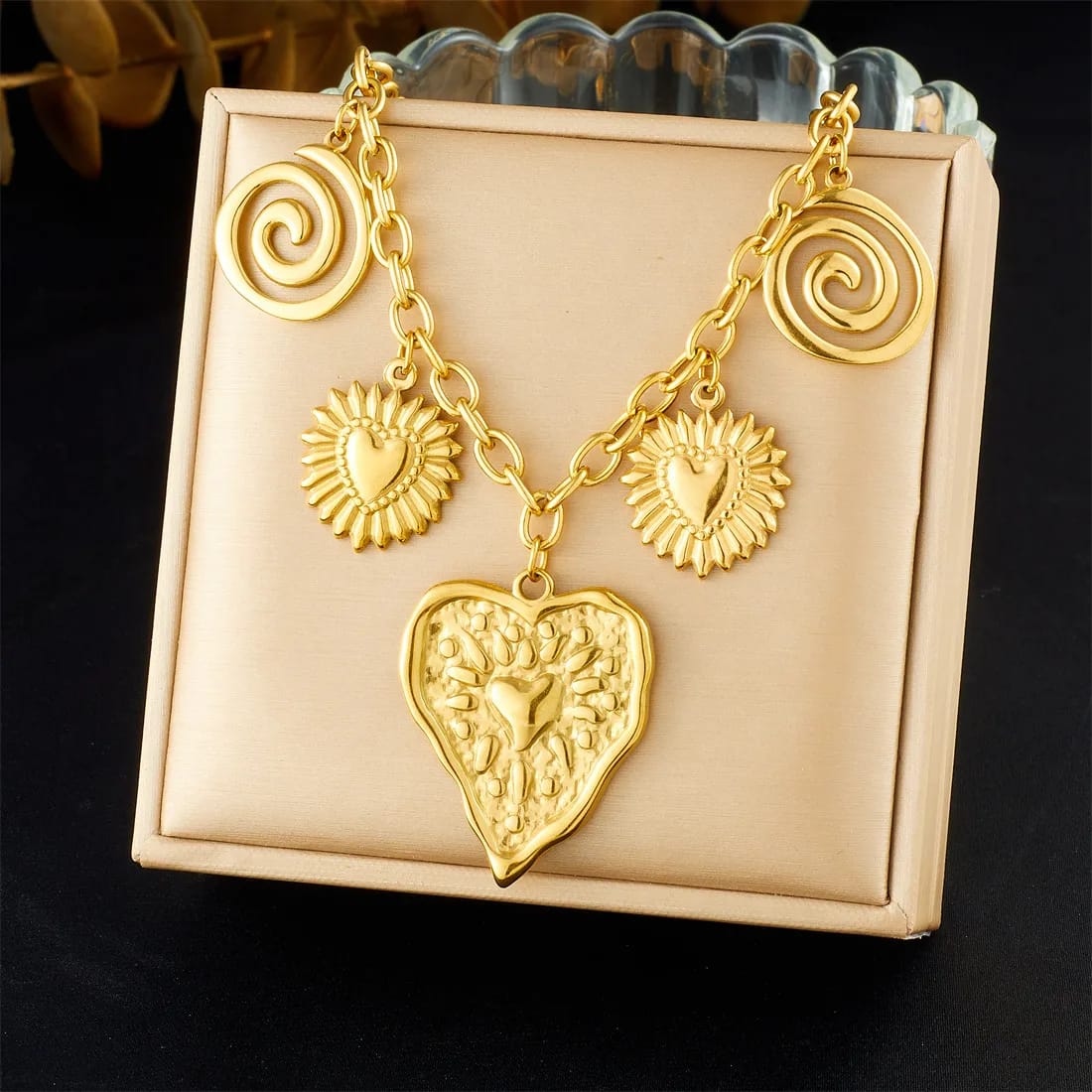 Collar multi charms, corazones y espirales, acero inoxidable, chapados en oro, ajustable.
