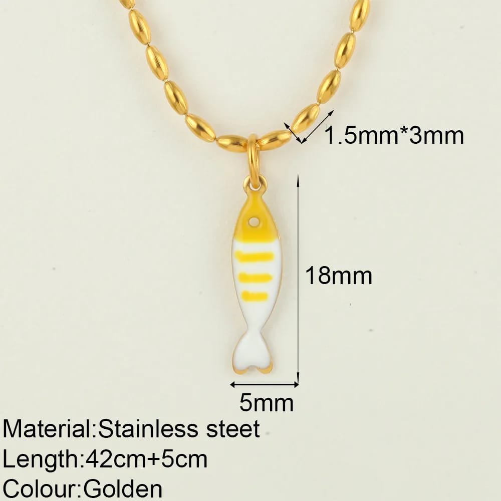 Cadena de acero inoxidable color dorado, cadena de olivas, sardina esmaltada color amarillo con blanco.