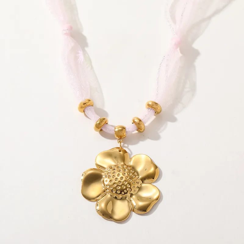 Collar de organza colo rosa tenue, flor de acero inoxidable, chapado en oro de 18 quilates, ajustable.