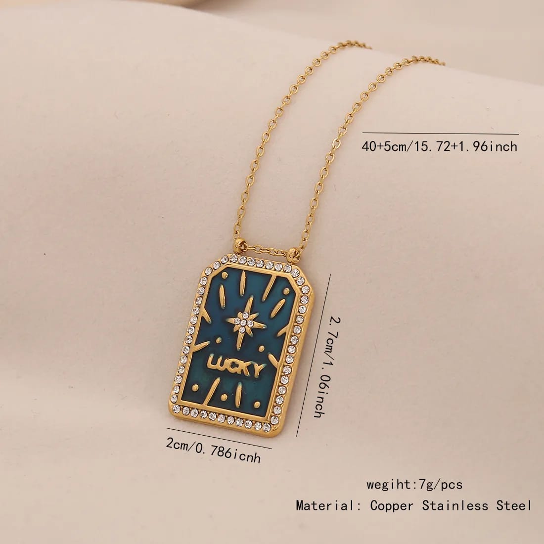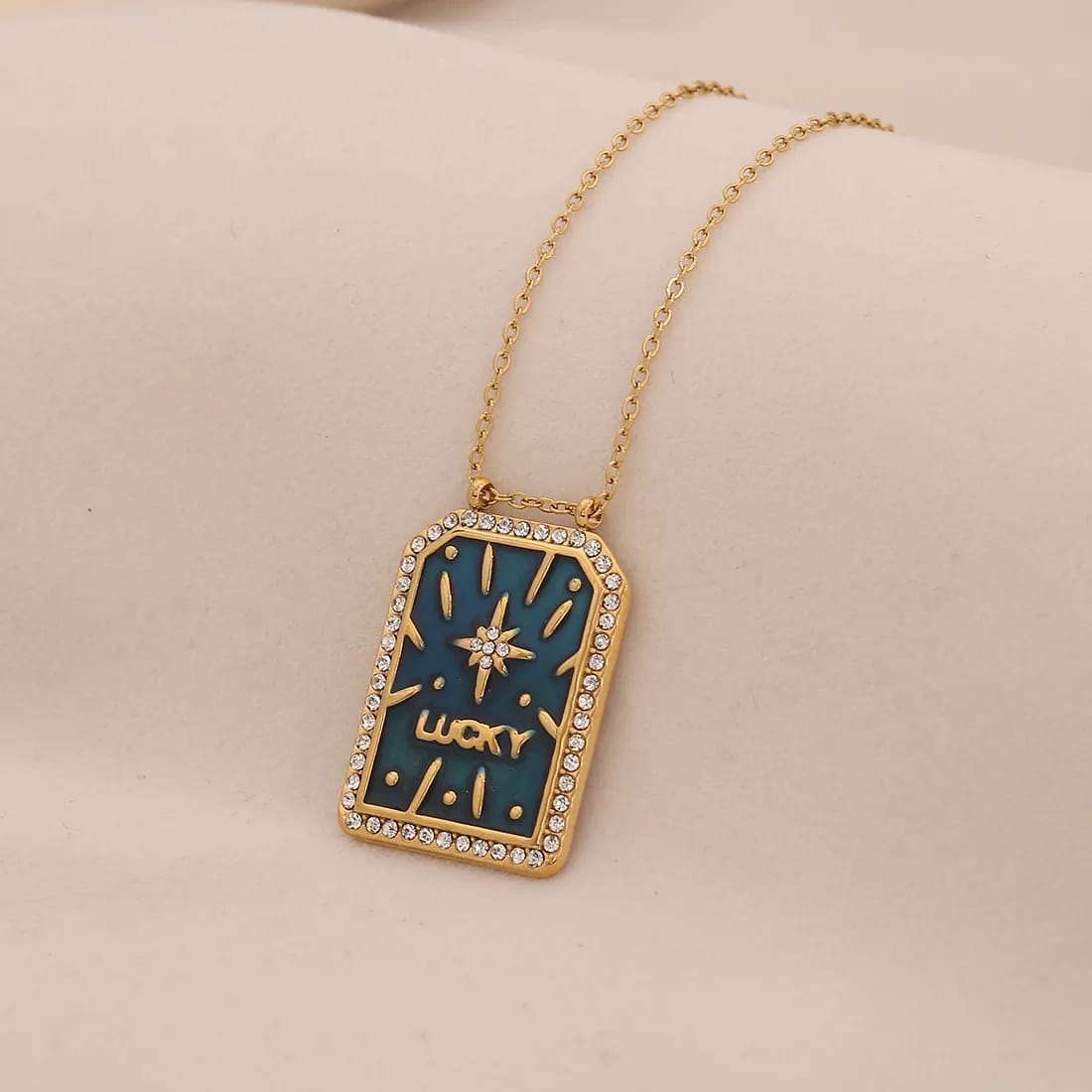 Collar de acero inoxidable, chapado en oro de 18 quilates, con incrustaciones de circonias, plaquita esmaltada color verde botella.