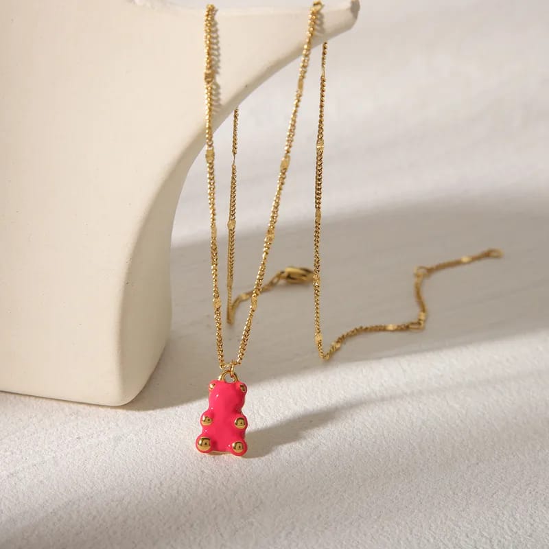 Acero inoxidable, chapado en oro de 14 quilates, osito esmaltado, una cara , cadena marinera, color: rosa- rojo, peso aproximado: 10 gr
