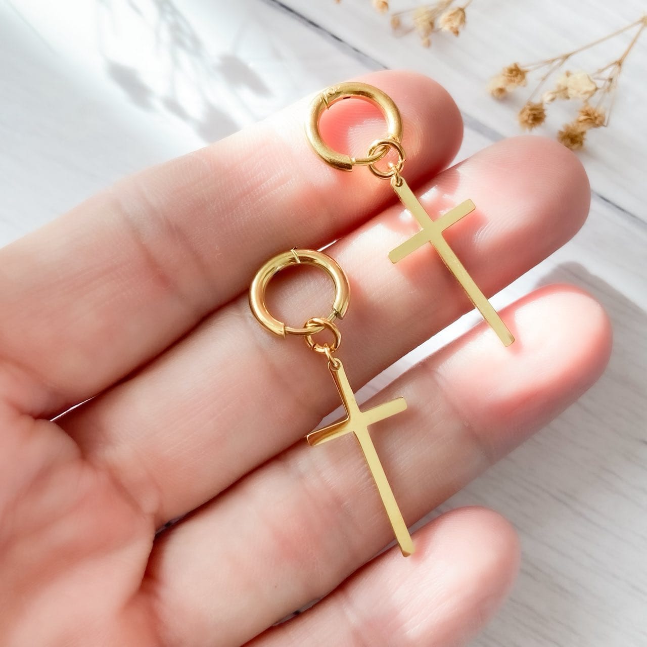 Huggies con cruz alargada, acero inoxidable, resistente al agua, hipoalergénico, tamaño mediano.