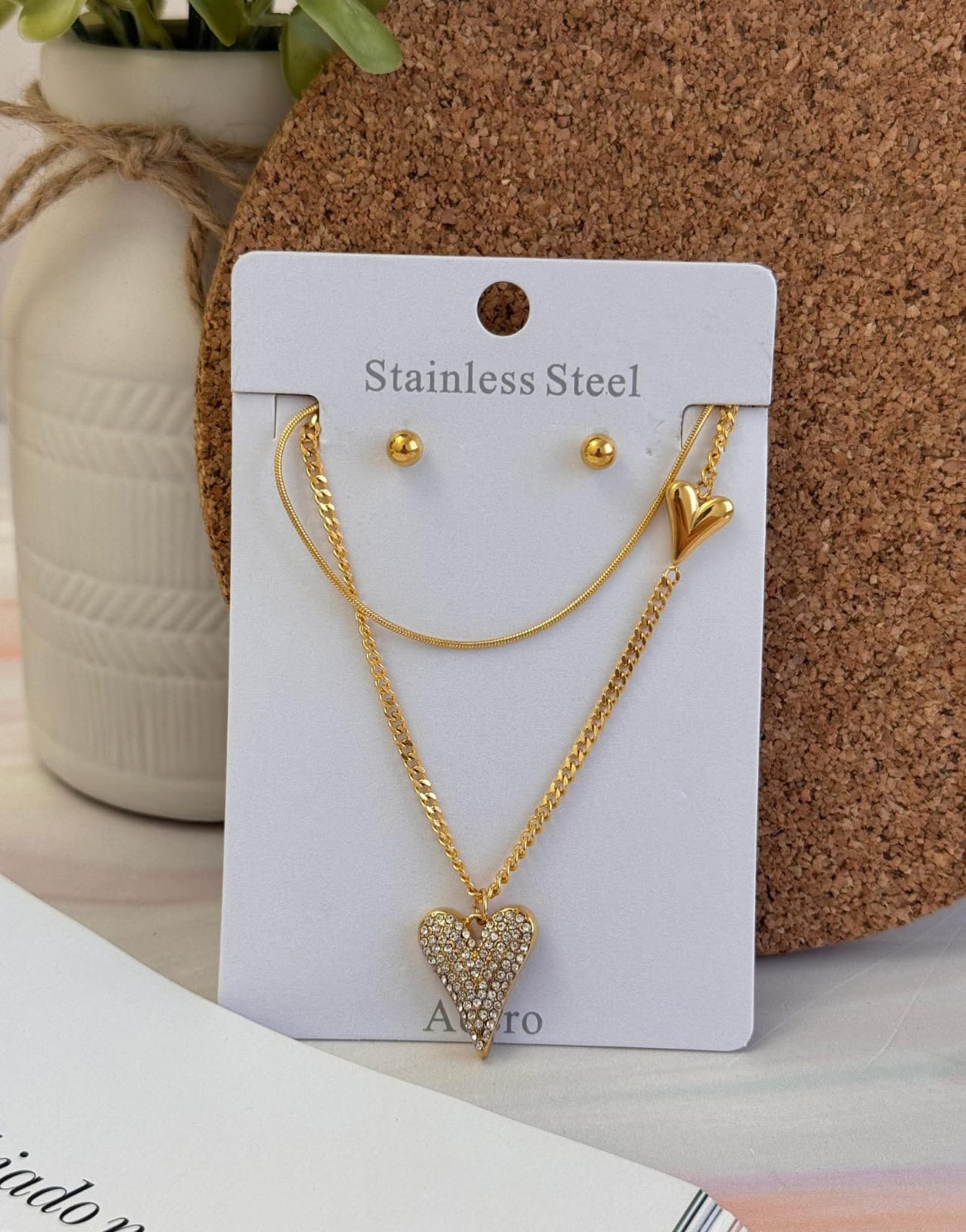 Juego de collar a dos capas de corazón con circonias, acero inoxidable, ajustable, aretes pequeñitos, ajustable.
