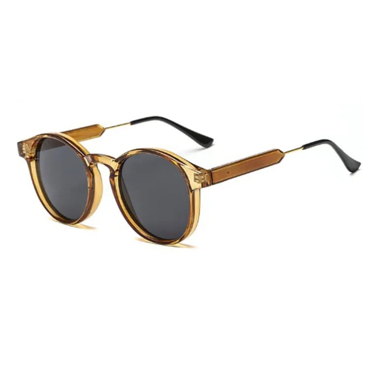 Armazón redonda, acrilico color champagne, varillas cubiertas de acrilico, micas color negro claro.