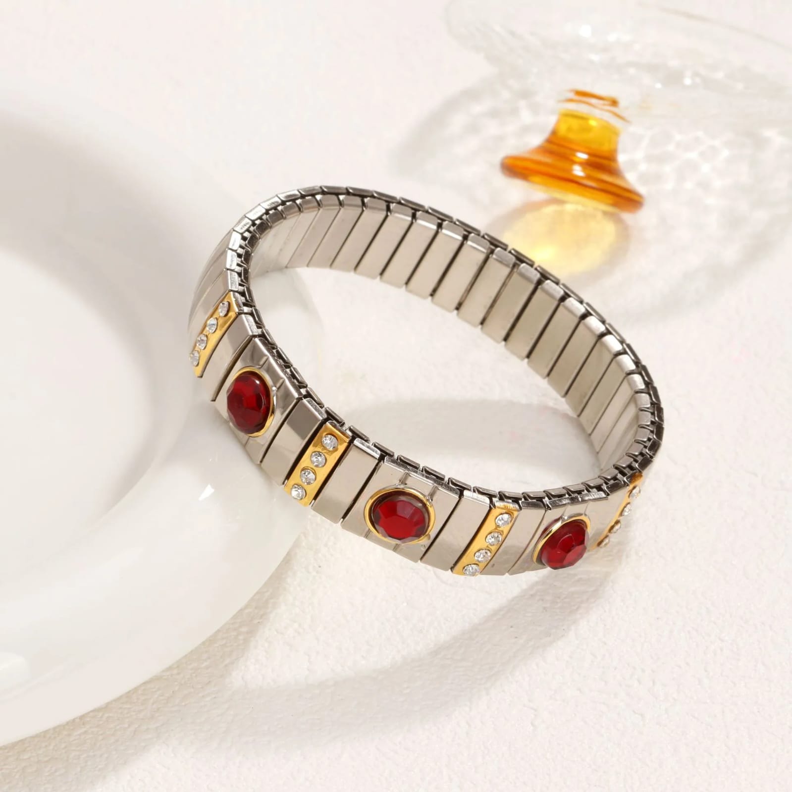 Pulsera elástica de acero inoxidable, incrustaciones de circonias rojas e incrustaciones de mini circonias .