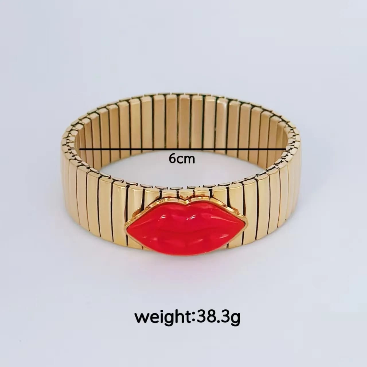 Pulsera dorada elástica de acero inoxidable con labios rojos de acrilico.