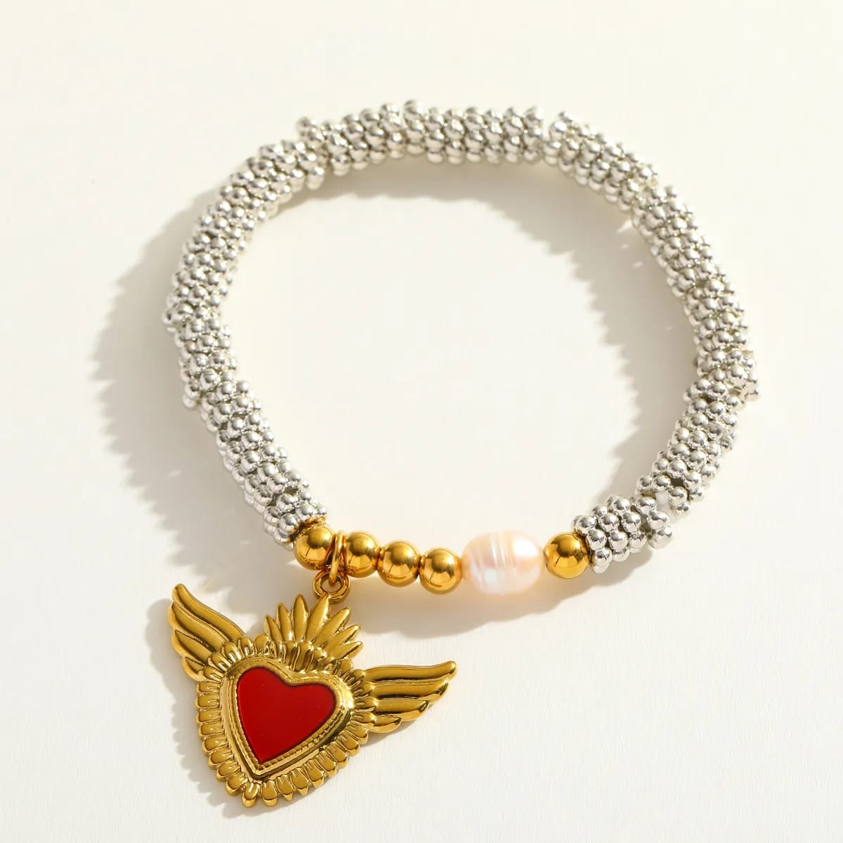Pulsera elástica con multi aritos, dije de corazón rojo con dorado, color mixto, con perlita de agua dulce, acero inoxidable, chapado en oro de 18 quilates.
