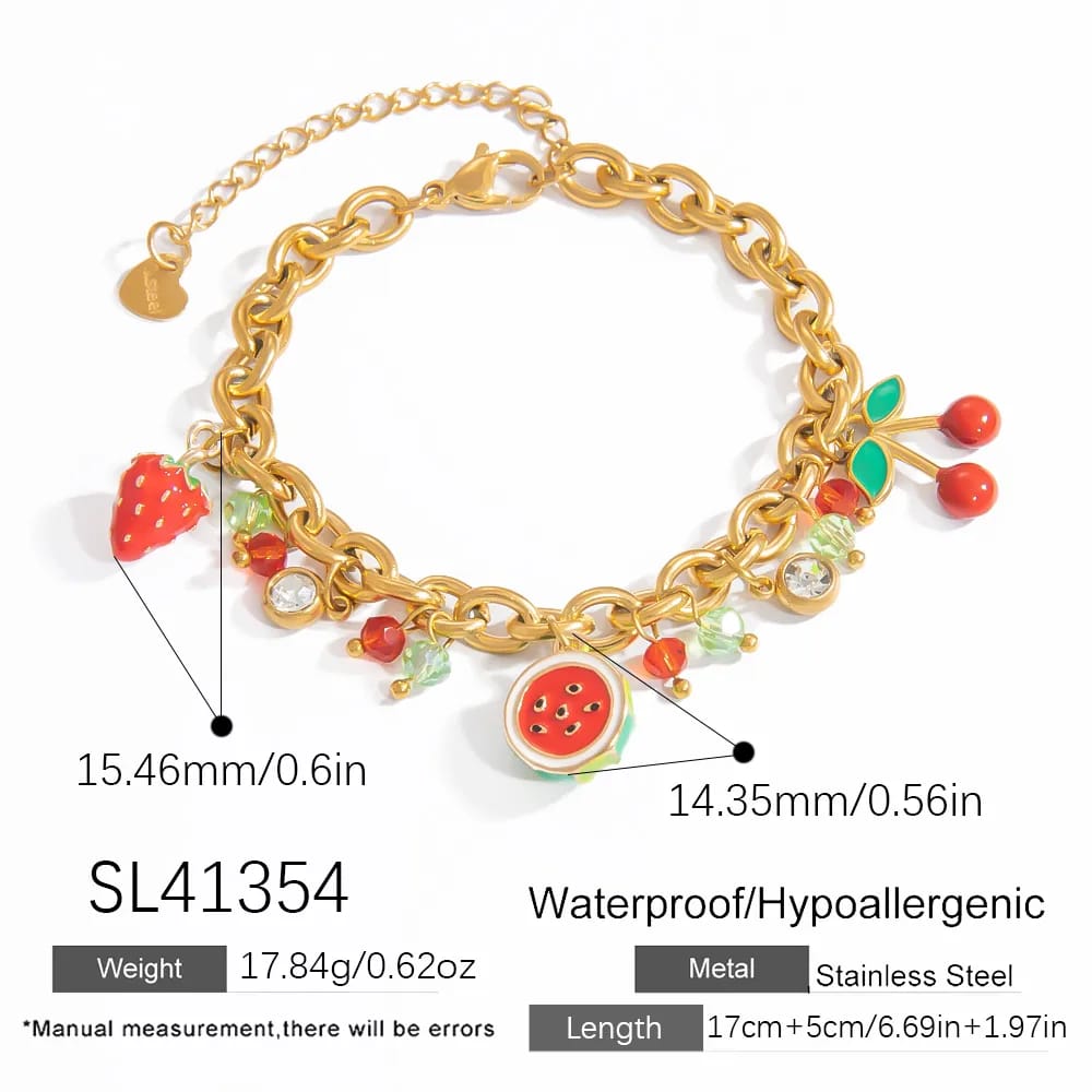 Pulsera multiples charms sandias, fresas, cerezas, acero inoxidable, chapados en oro de 18 quilates, hipoalergénico, water proof, atemporal.