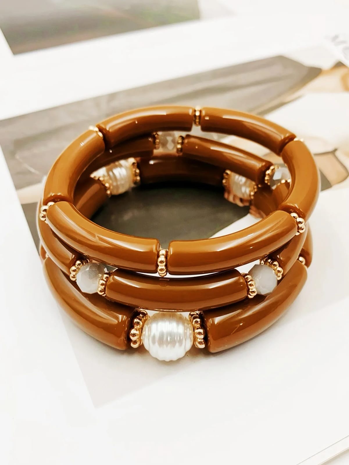 Trio de pulseras de acrilico color café, cuentas de cristal y perla sintética, fantásia, elásticas.