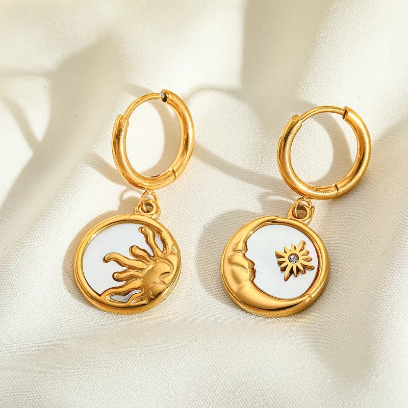 Aretes tipo huggie luna y estrella con madre perla, acero inoxidable, chapados en oro de 18 quilates, tamaño mediano, super ligeros.