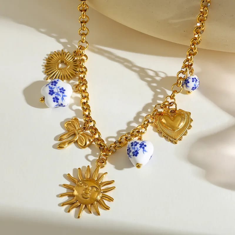 Collar charms talavera, acero inoxidable, chapado en oro de 18 quilates, ajustable.