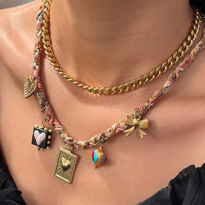 Collar de cuerda poliéster ajustable con multi charms de acero inoxidable y cerámica, chapado en oro de 18 quilates.