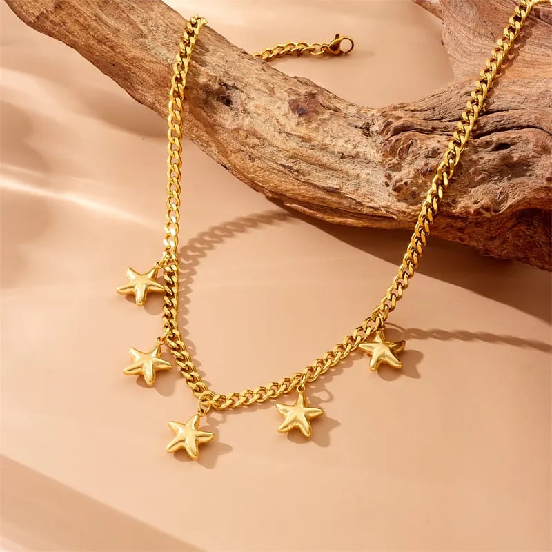 Collar con charms de estrellas, cadena con eslabones cubanos, acero inoxidable, chapado en oro de 18 quilates.