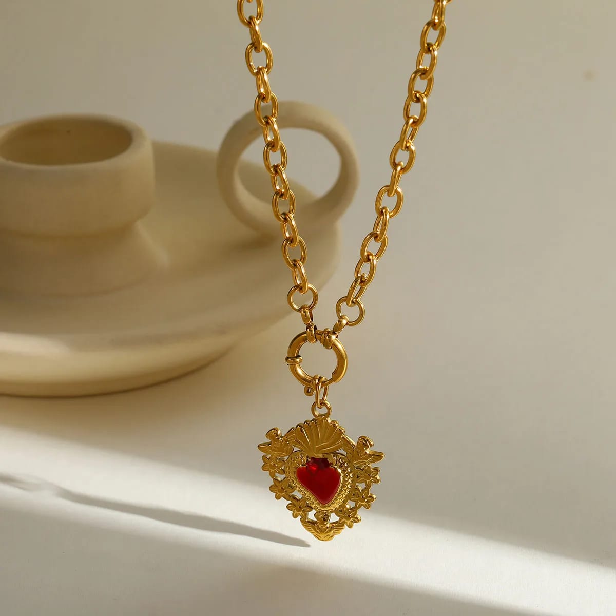 Collar corazón rojo esmaltado, acero inoxidable,  chapado en oro de 18 quilates, ajustable.