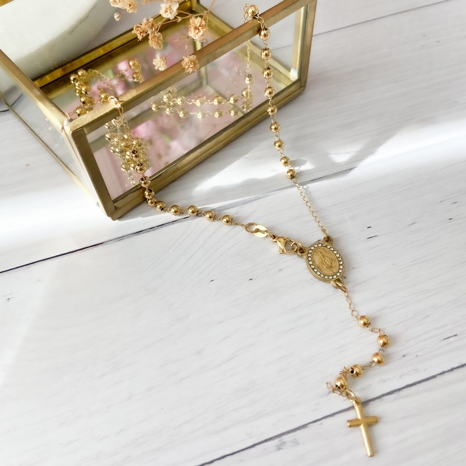 Rosario largo, con incrustaciones de circonias, acero inoxidable, resistente al agua.